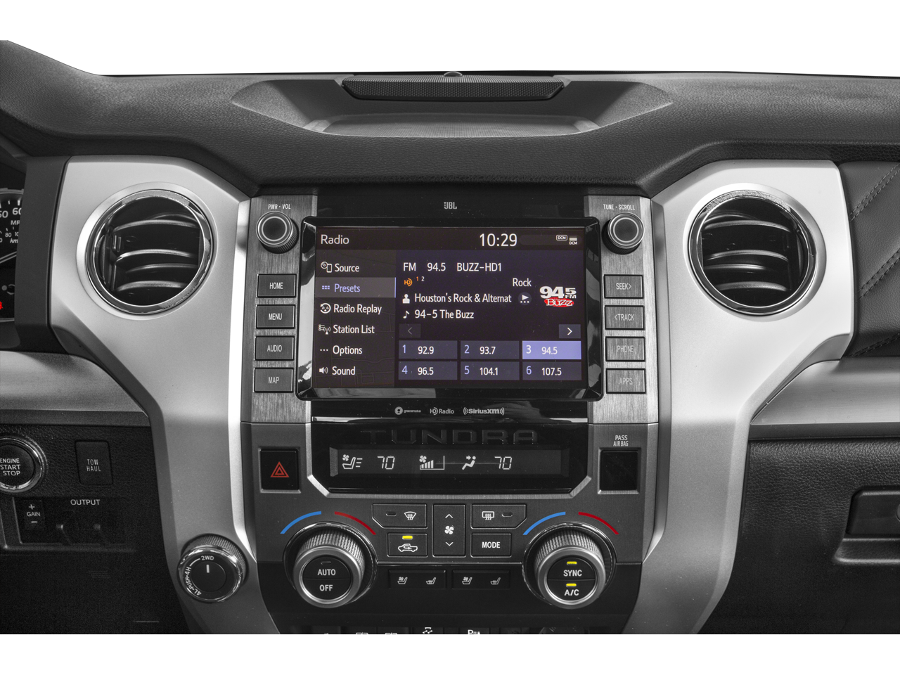 - Radio: Entune Premium JBL Audio AM/FM/HD Radio/CD -inc: integrated navigation system, MP3/WMA playback capability, AM/FM cache radio, 12 JBL speakers including subwoofer and amplifier, 7" high-resolution touch-screen display w/split-screen, auxiliary audio jack, USB media port, HD predictive traffic and Doppler weather overlay, Bluetooth® hands-free phone capability w/advanced voice recognition, phone book access and music streaming and Siri Eyes Free, Entune App Suite, Destination Search, iHeartRadio, Yelp and Slacker Radio, SIRIUSXM Satellite Radio, complimentary SiriusXM All Access 90-day trial subscription